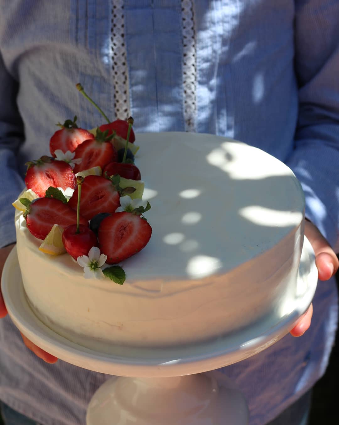 Para a cobertura, bata o mascarpone, as natas e a colher de sopa de açúcar em pó, até obter um creme firme. Barre o bolo com este creme e decore com frutos vermelhos.