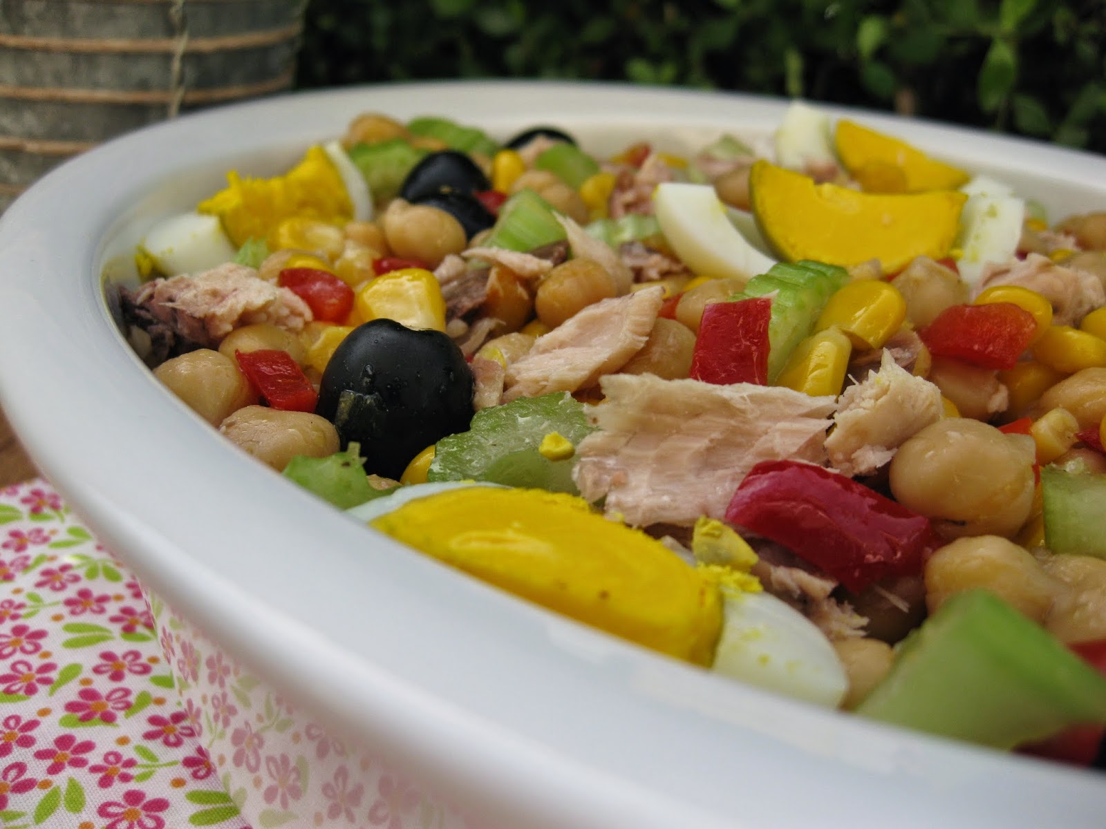Numa taça coloque o grão de bico e o milho escorridos. Junte as azeitonas, o pimento cortado em cubinhos, o aipo cortado em rodelas, os filetes de cavala em lascas, e os ovos cozidos. Tempere com sal e pimenta e regue com um fio de azeite. Envolva delicadamente.