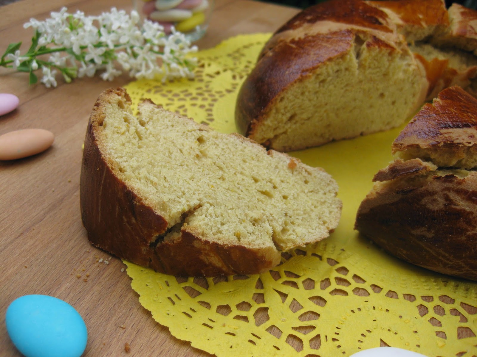 Enrole pelo lado mais comprido e divida em 9 partes iguais (eu acabei por me distrair na contagem e fiquei com 10). Disponha na forma afastadas umas das outras, com a parte do corte para cima. Uma no centro e as restantes à sua volta, formando uma flor. Deixe levedar mais 30 minutos (eu coloco no forno a 50ªC) até aumentarem de volume e ficarem em contacto umas com as outras. Pré-aqueça o forno a 180ºC e leve a cozer cerca de 30 minutos.